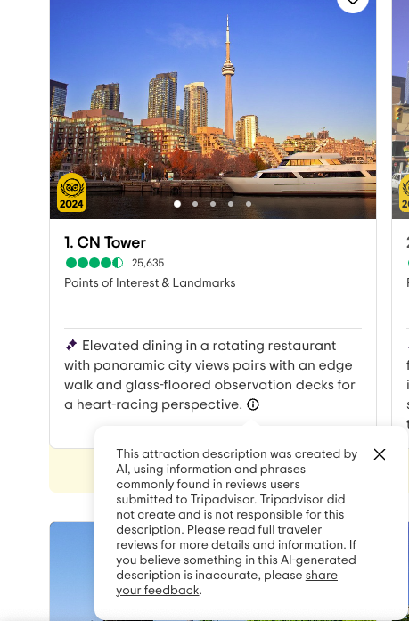 Click on the “i” to show a blurb explaining that the description is AI-generated, and that TripAdvisor is “not responsible for this description.”