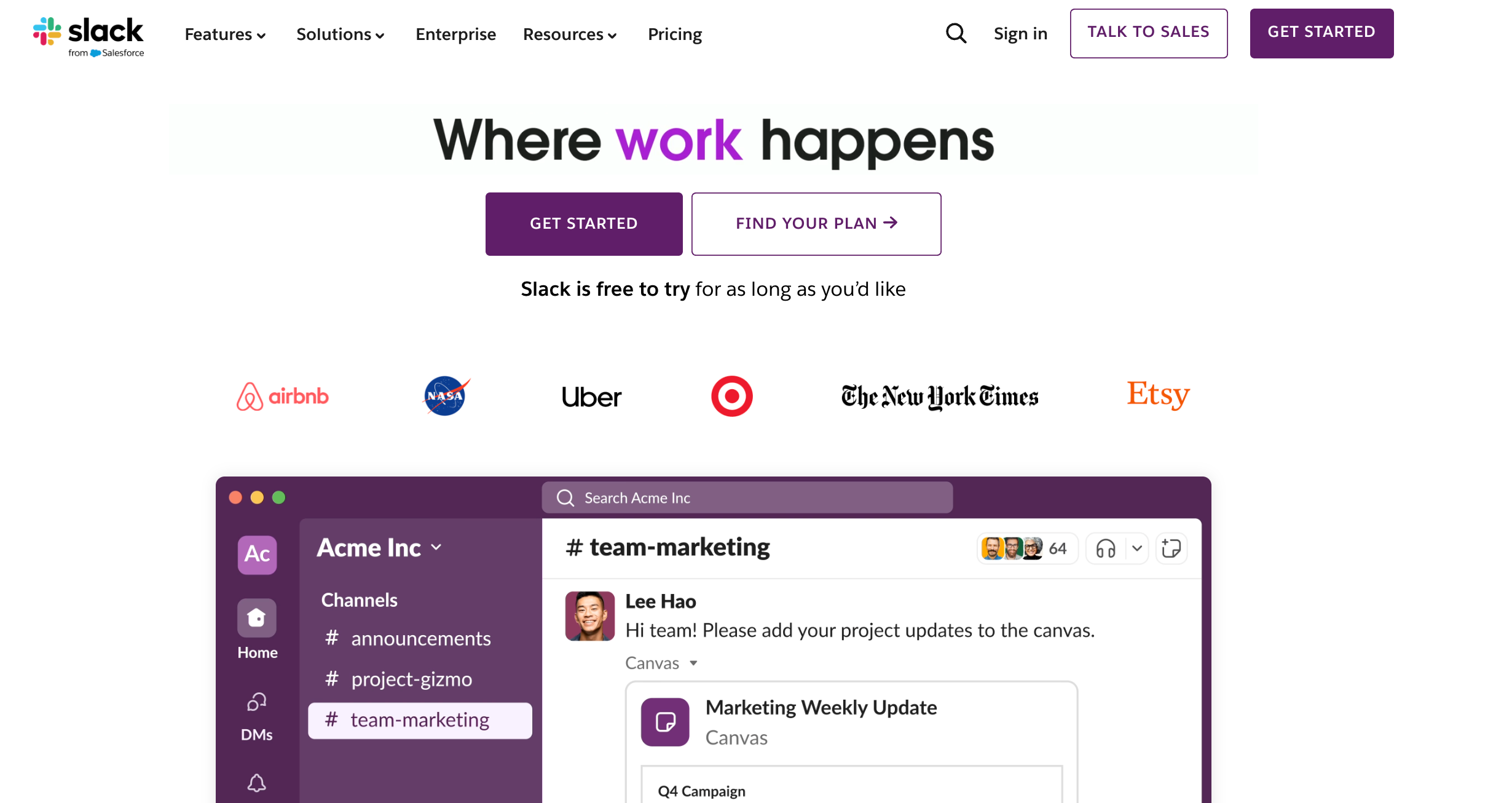 What’s more, Slack offers a free version, making it accessible to businesses and individuals of all sizes. As you scroll down the page, you’ll find logos and customer success stories from big-name customers such as Airbnb, NatWest and Uber. This gives you a sense of security about the product and reassures you that you’re in good hands. And if you have any questions or concerns, there’s a chatbot available for support. All in all, Slack has proved they know what they’re doing when it comes to web design and user experience. Way to go!