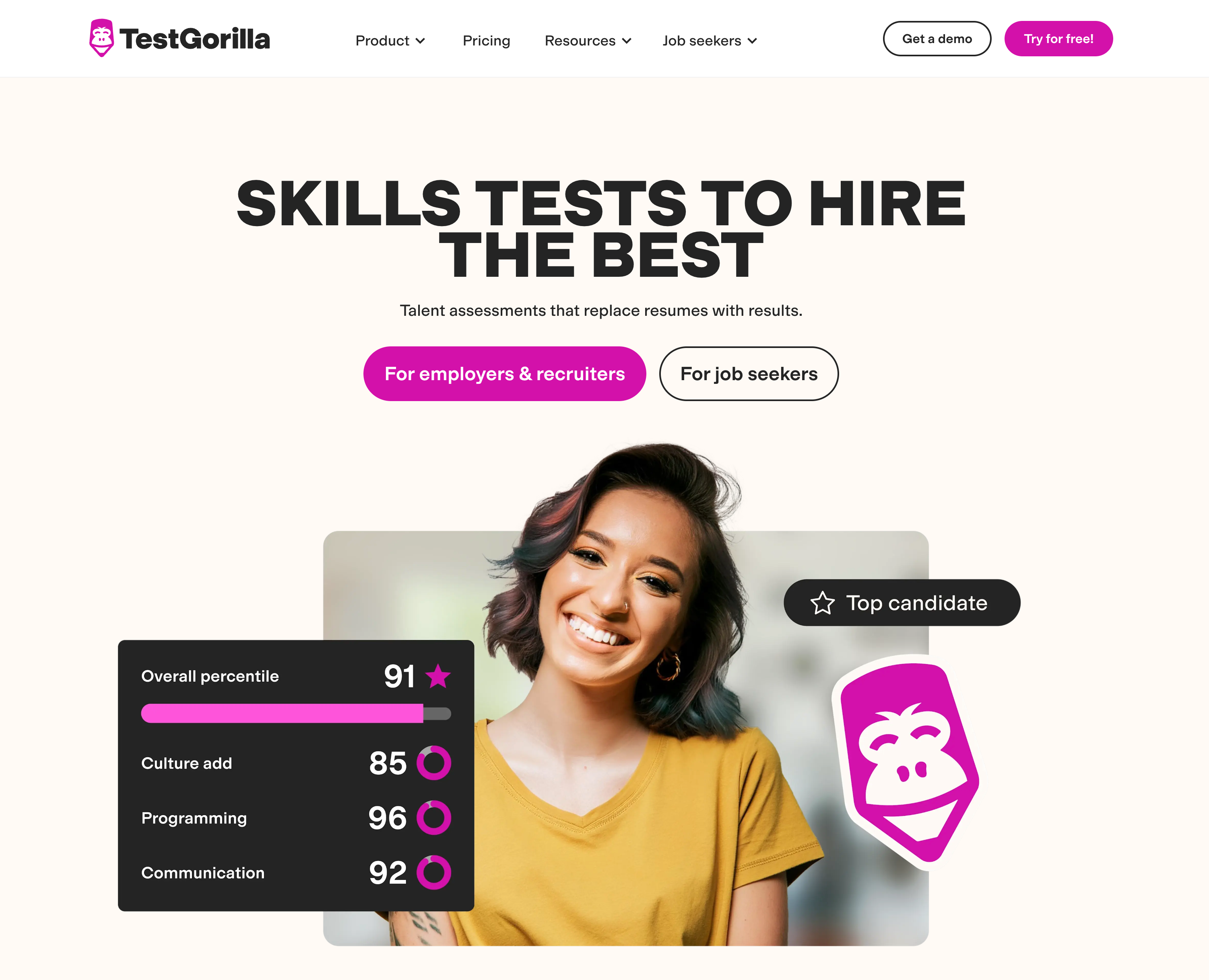 TestGorilla is an online platform that helps companies find the right candidates for their teams. And their website design is a perfect reflection of their mission to make the hiring process easier and more efficient. The website is organized and easy to navigate, with a great mix of real pictures and illustrations that make the site visually appealing.