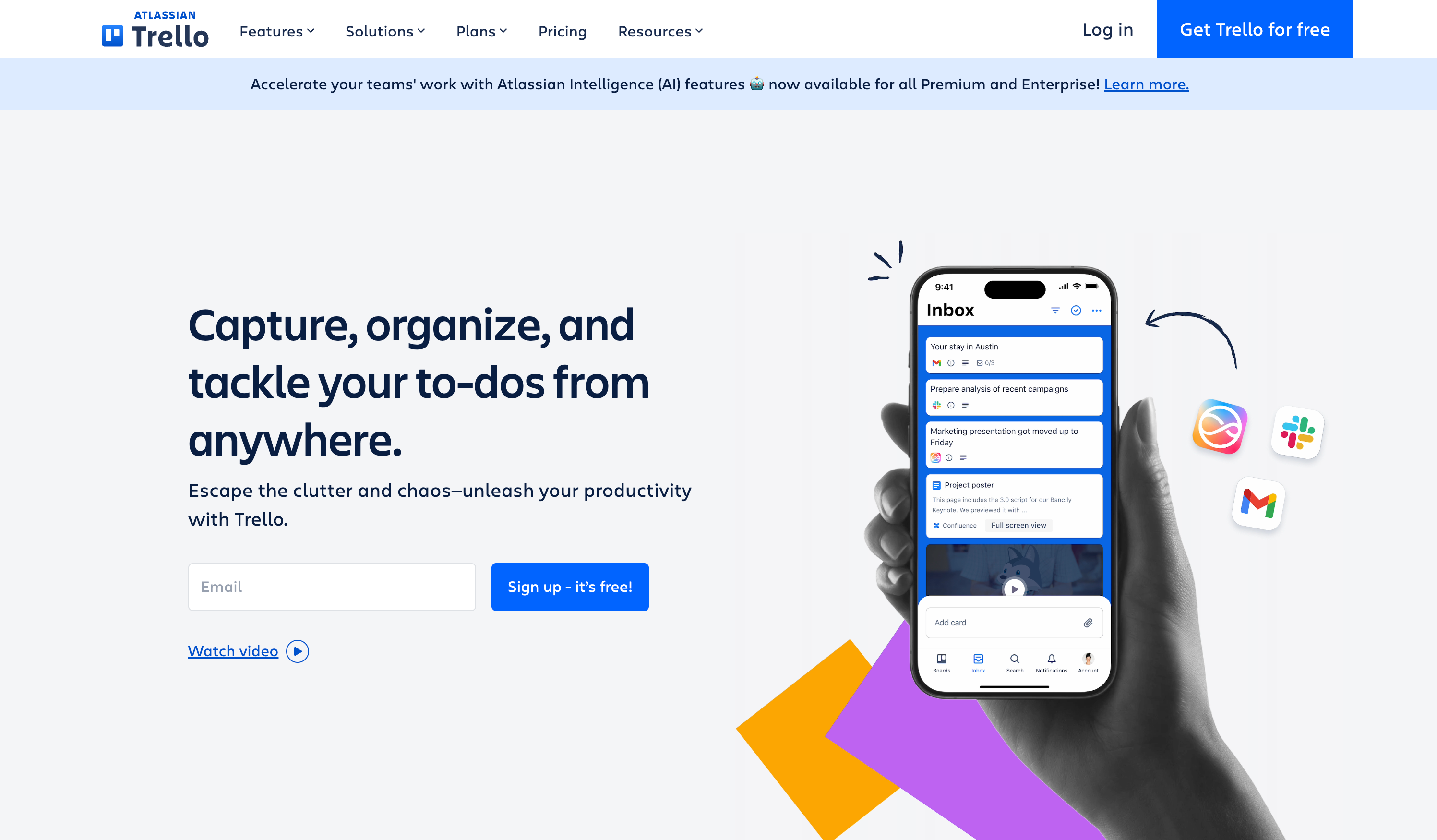 It’s clear that Trello put a lot of thought into its website design, much like the careful curation you’d find in a well-crafted Etsy storefront, making lists, organizations and boards feel exciting and fun to explore. No chatbot here, but there’s a “Contact Us” button that gives you several options for support. The use of interactive elements and animated GIFs adds to the visual appeal, making it one of the best SaaS website examples out there.