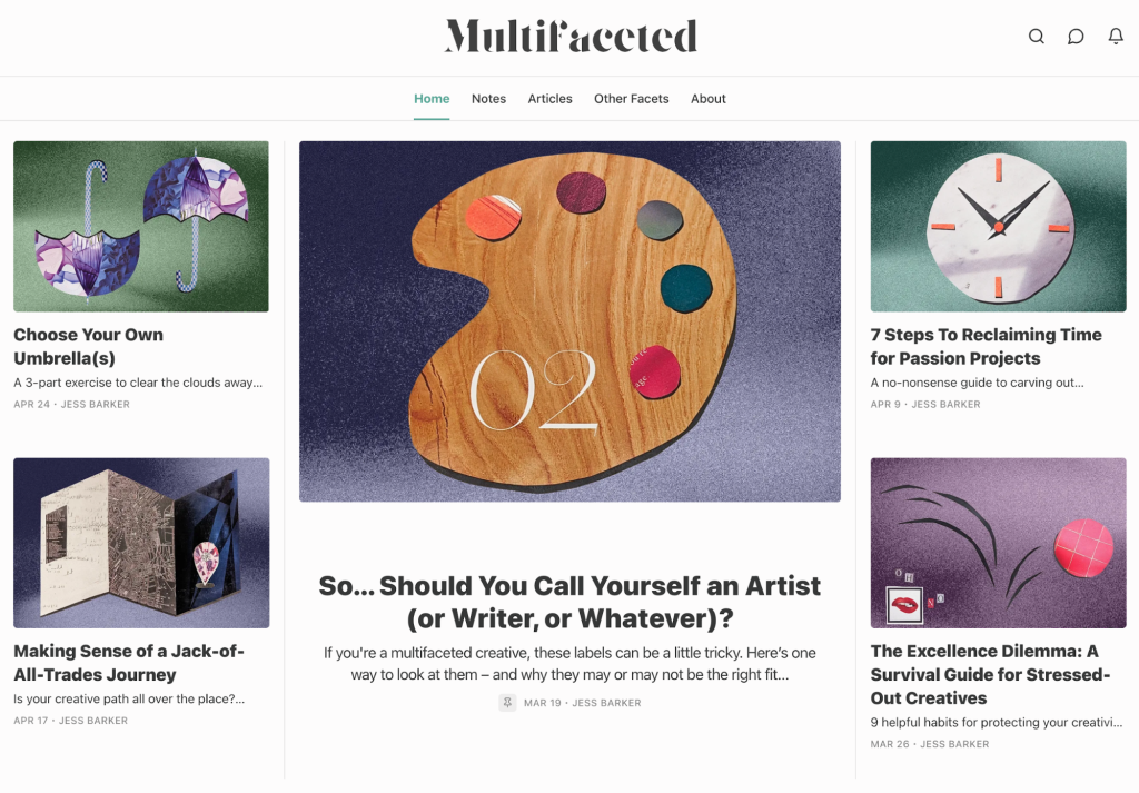Called Multifaceted, it’s a weekly newsletter about finding delight and direction in a creative life made up of many different interests. (If you’re a multi-hyphenate creative, jack-of-all-trades or marketer with a million artsy hobbies, it’ll be right up your alley.)